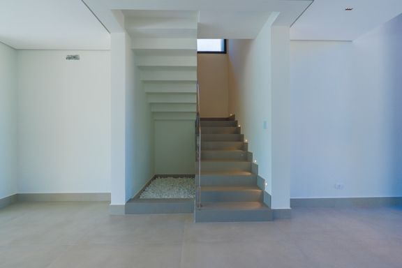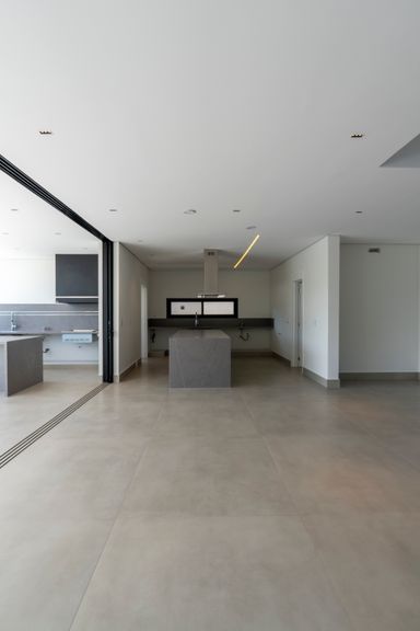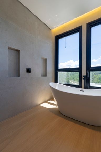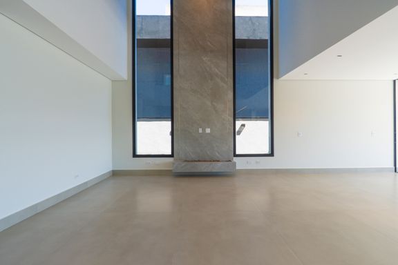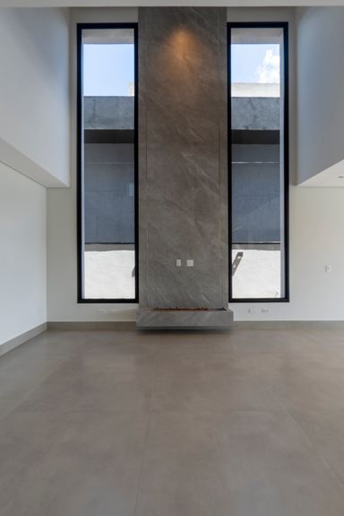 * Parede do living (pé-direito duplo), lareira e lavabo em Ultracompacta Orobico